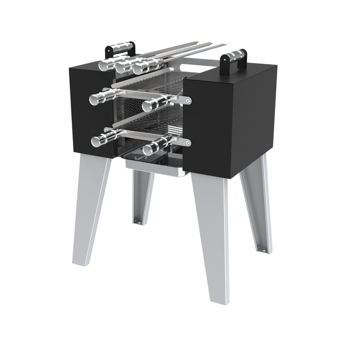 - Hastes Frontais, Painel traseiro, Grelhas e espetos fabricados em INOX ESCOVADO.