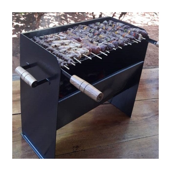 Churrasqueira feita de Aço Carbono, é pequena e leve, ideal para apartamento, casa, camping, pescaria e ambientes fechados.