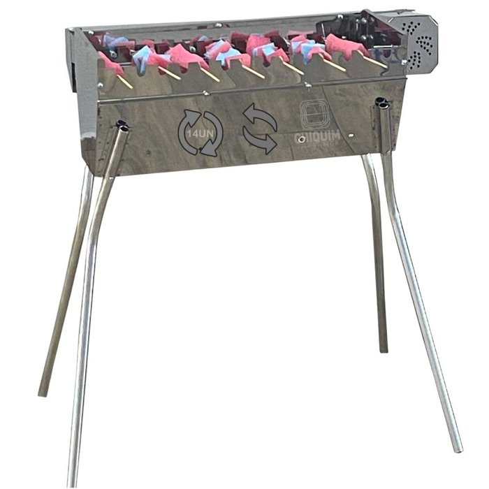 A churrasqueira Giratoria de Espetinhos, com a sua estrutura em Aço Chapa Minimizada (galvanizada), tem capacidade para acomodar 14 espetinhos e com autonomia em média de até 100 espetinhos por hora. Equipada com um motor elétrico WEG Bivolt, dando o maior conforto e segurança no preparo do seu churrasco.