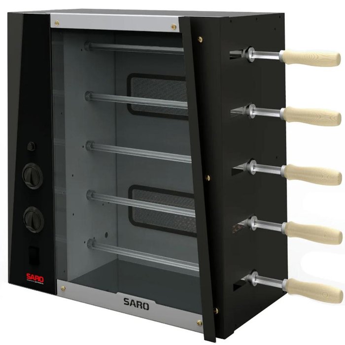 Churrasqueira Rotativa á Gás GLP Saro de 5 Espetos com Acendedor Automático Bivolt.<br><br>Garantia: 90 dias / Peso: 24kg / Cor predominante: preto / Referência: 7026538980578<br>Dimensões:55cm (C) x 33cm (L) x 65cm (A);<br>Dimensões internas: 41cm (C) x 22cm (L) x 62cm (A); <br>Material: aço inox 304;<br>Capacidade: 7,5kg de carne;<br>Capacidade por espeto: 1,5kg de carne;<br>Atende até: 18 pessoas;<br>Temperatura máxima: 350ºC;<br>Voltagem: bivolt;<br>Consumo de gás: 0,360kgh;<br>Potencia do gás: 5.000kcal.<br><br>DIFERENCIAIS:<br>Possui acendedor automático;<br>Possui bandeja coletora de gordura; <br>Possui queimador infravermelhos de alto calor; <br>Possui fio anti-chamas certificado pelo INMETRO;<br><br>Limpeza e cuidados:<br>- Lavar com água fria e sabão neutro utilizando esponja macia, seguido de pano seco;<br>- Não utilizar produtos químicos ou abrasivos na limpeza;<br>- Evitar contato com objetos cortantes.<br><br>Esta churrasqueira veio para transformar o mercado conservador, com um design único, ela ainda possui a mesma versatilidade e eficiência de sempre. Podendo assar até 7,5kg de carne por vez, atendendo um churrasco de até 18 pessoas com elegância. Ao não emitir fumaça esta churrasqueira se torna ideal para apartamentos ou ambientes com pouca ventilação. Instale a sua churrasqueira onde quiser, sem se preocupar com sistema de exaustão ou ventilação.
