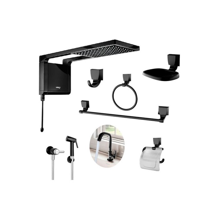 Chuveiro Acqua Storm Preto + Kit 7 Peças Banheiro Lorenzetti Acqua Storm + Acessórios