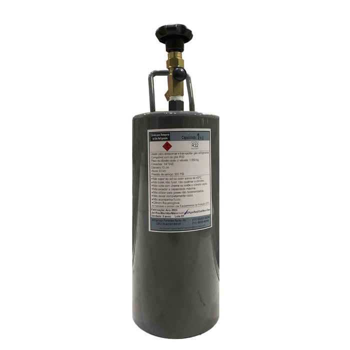 - Pressão de Serviço: 300PSI Aplicável em: - Transporte e Armazenamento de Gases Refrigerantes R32 Itens que Acompanham: - Cilindro para Transporte de Gás Refrigerante 1Kg - R32- Não acompanha o fluido.