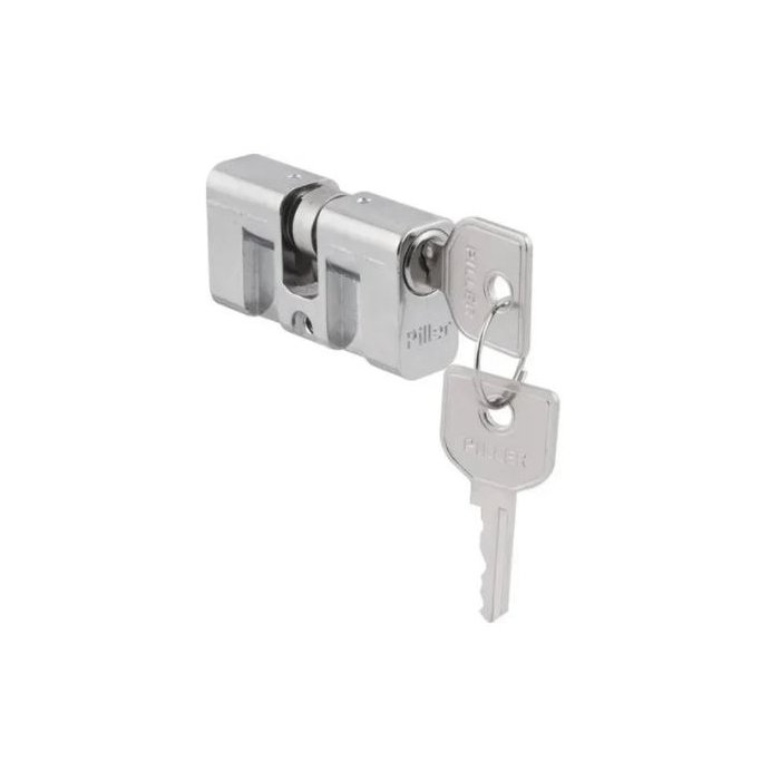 Acompanha duas chaves com acabamento niquelado, o bloco, rotor e o came fabricado em zamac no acabamento cromado e o parafuso de fixação do cilindro é fornecido acabamento cromado.