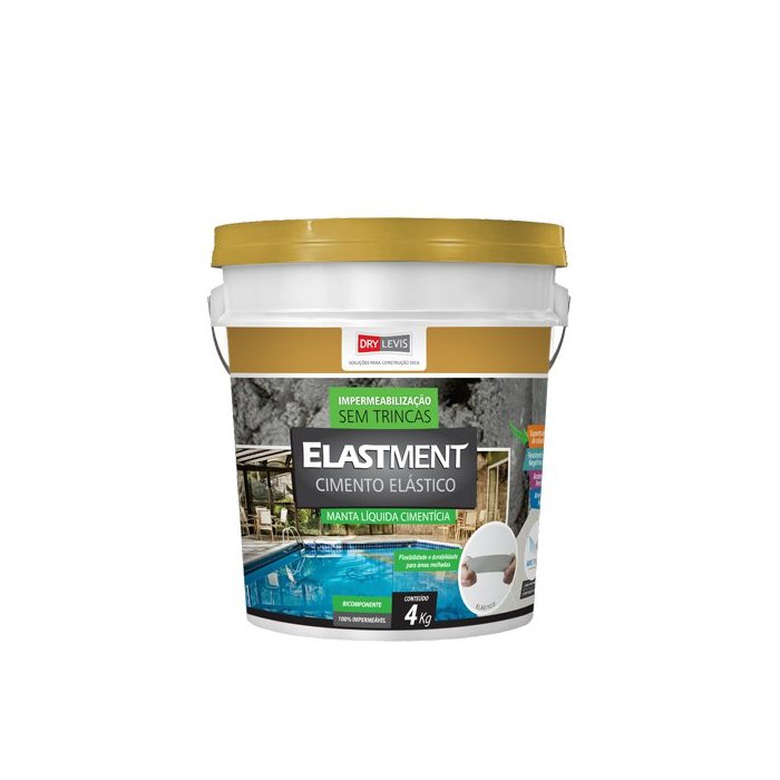 O Elastment Cimento Elástico é uma manta líquida cimentícia, impermeabilizante, bicomponente à base de polímeros acrílicos com alto poder de aderência. É 100% impermeável, flexível e com propriedades elásticas que proporcionam mais capacidade de permanência íntegra em áreas sujeitas a trincas, fissuras, umidade ascendente e umidade em pressão negativa e positiva. Altamente eficaz mediante exposição permanente ao sol, maresia e intempéries em áreas sem trânsito.