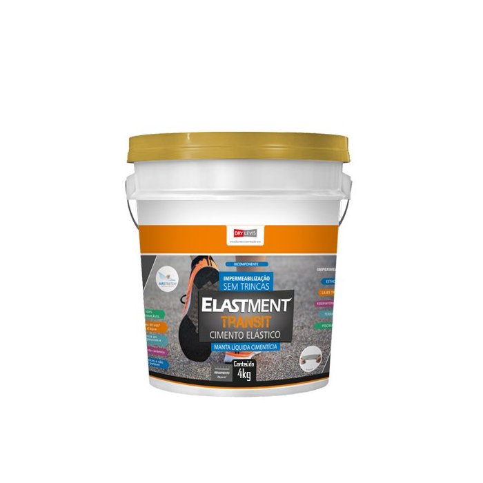 O Elastment Cimento Elástico Transit da Drylevis é um impermeabilizante acrílico base água e cimento Portland, ideal para aplicação em áreas expostas a pressões negativas e positivas, resistência a tráfego de pessoas e veículos.