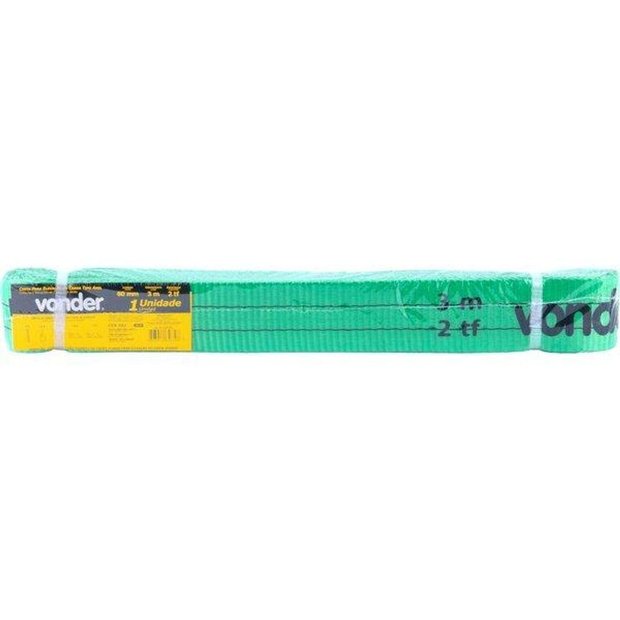 Cinta Elevação De Carga Vonder 7:1 3 Metros 2 Toneladas Ref. Fornecedor: 8014302060 Marca: VonderConteúdo Embalagem:1 Cinta para elevação de cargasAplicações e dicas de uso:Indicada para elevação e movimentação de cargas. Nunca utilizar para transporte e elevação de pessoas ou animais.Destaques e diferenciais:Possui excelente resistência, flexibilidade e facilidade no manuseio, reduzindo o esforço durante a operação, além de oferecer menor risco ou danos na movimentação de cargas. Cinta plana de elevação de carga tipo anel.Características Técnicas:Carga de trabalho da cinta em elevação vertical/direta: 2,0 tf Comprimento total da cinta elevação de carga: 3,0 mFator de segurança da cinta de elevação de carga: 7:1Largura da cinta: 60,0 mmMaterial da cinta: 100% PoliésterNorma de referência da cinta : ABNT NBR 15637-1Produto: Cinta