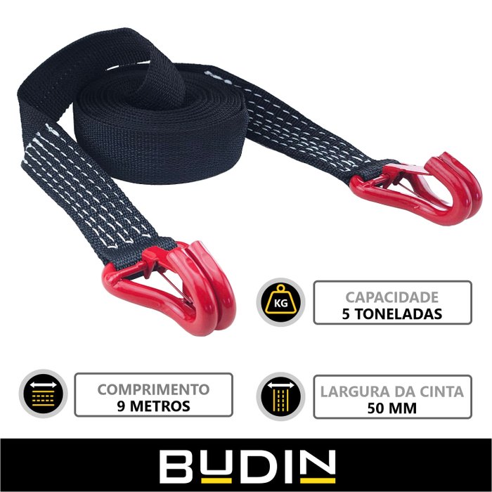 Cinta Fita para Reboque e Arraste Budin - 5 Toneladas - 9 Metros - Gancho 1/2 - para Puxar Carros, V