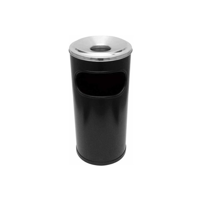 Confeccionada em chapa de aço carbono 1020 e acabamento pintura epóxi, fundo em plástico ABS de alta resistência, aro em alumínio, furos laterais para jogar lixo e cinzeiro na parte superior da lixeira.