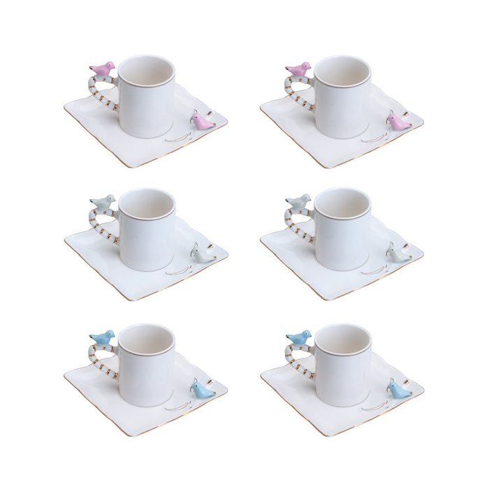Cj 6 Xícaras P/Café C/Pires Quadrado Porcelana Birds Design Plate Colorido 80ml Wolff