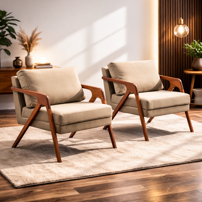 Cj Poltrona Mona Pés Madeira Maciça Almofadas Inclusas Linho:bege