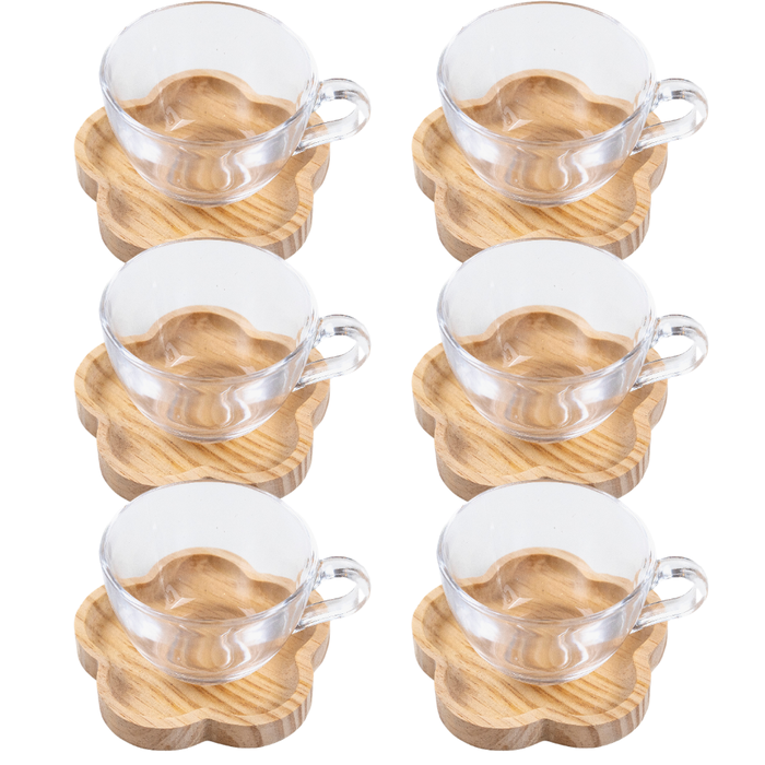 Este kit é composto por 6 xícaras de vidro transparente 230ml e 6 pires em madeira pinus, trazendo um toque de natureza e requinte para a sua mesa.