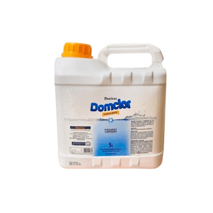 Floculante e Clarificante DomClor tem alto desempenho, aglomera as partículas de sujeira na água, recuperando seu brilho e livrando-se da sujeira. Sua fórmula exclusiva melhora significativamente o desempenho do filtro. Policloreto de Alumínio e Veículo. Princípio Ativo: Policloreto de Alumínio. Teor: 30 % p/p. Antes de utilizar o produto verifique a alcalinidade da água que deve estar entre 80 e 120 ppm. Para manutenção utilize 1,5 ml/m³ e em caso de turbidez da água adicione de 3 a 6 ml/m³, filtre ou recircule a água por 15 minutos, após a floculação aspire o fundo da piscina drenando e retrolave o filtro. Precauções: CONSERVE FORA DO ALCANCE DAS CRIANÇAS E DOS ANIMAIS DOMÉSTICOS. Não ingerir. Evite aspiração ou contato com os olhos. Em caso de ingestão, não provoque vômito e consulte imediatamente o Centro de Intoxicações ou o médico levando o rótulo do produto. Evite o contato prolongado com a pele. Depois de utilizar este produto, lave e seque as mãos.
