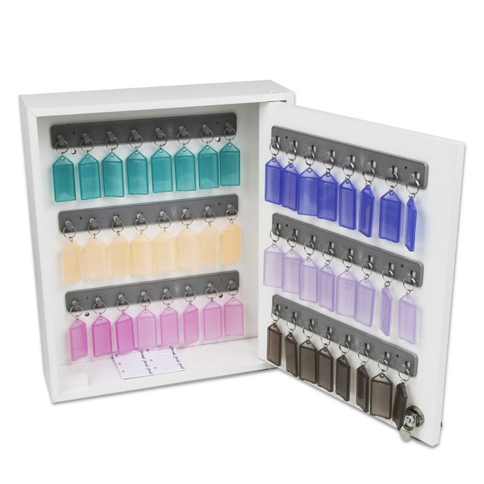 Claviculário organizador para 48 chaves com Fechadura e Chave de segurança. Acompanha 48 chaveiros coloridos.