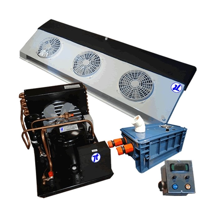 • Composição do kit: condensadora com visor de liquido, pressostato, filtro secador e tanque de liquido; unidade evaporadora com válvula de expansão, válvula solenoide, revestimento antigotejamento e antisudação; painel de controle com caixa de acondicionamento, controlador digital, interruptores on/off e fusíveis de proteção; manual de montagem