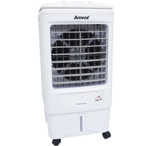 Climatizador Amvox ACL 018. Possui tanque de água de 18 litros, 3 velocidades, swing automático e controle mecânico. Fluxo de ar máximo de 3.000 m³/h. Intenso fluxo de ar e vasta área climatizada consumindo apenas de 1 a 2 L/h de água. Produto amigável ao meio ambiente.