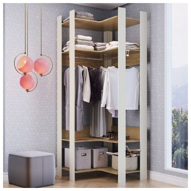 Closet Aberto de Canto 4 Prateleiras e Cabide Clothes Completa Móveis Off White/Itapuã