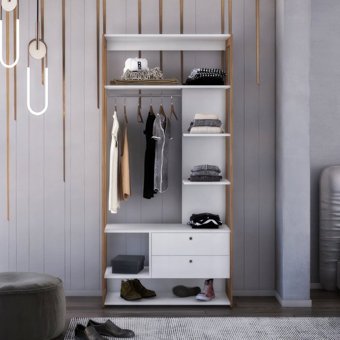 O Módulo de duas gavetas é amplo com espaço para cabides e prateleiras largas, módulo de sapateira, permite a personalização das prateleiras com opção de ser inclinada ou reta, a critério do cliente e o toque final é seu espelho com cantos arredondados que possibilita acoplar a porta em qualquer módulo e da o ar sofisticado que só a linha Cali tem.