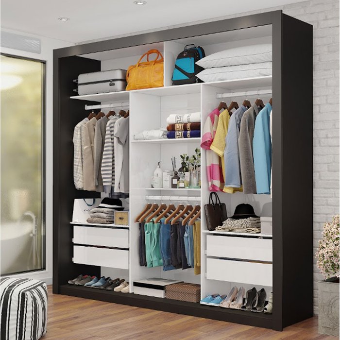 O Closet Casal Clarice com 04 Gavetas possui 2,08m de altura, 1,855m de largura e 0,46m de profundidade, combinado com 04 gavetas, 04 prateleiras e 03 cabideiros, deixa o produto com uma divisão funcional capaz de proporcionar ao cliente acomodar todas as suas roupas de maneira mais organizada e com maior visibilidade. Nos maleiros cabem edredons, cobertores, travesseiros, malas, toalhas, bolsas, entre outros. Os cabideiros, além de resistentes, não envergam com o peso dos moletons, ternos, sobretudos, camisas e acessórios. Prateleiras são ideias para colocar roupas de cama e de banho, perfumes, kits de maquiagem, caixinhas com acessórios e bolsas menores. As quatro gavetas fixadas sobre corrediças metálicas, são ótimas para guardar blusas dobradas, shorts, malhas e roupas íntimas. Estrutura do produto em MDP. Produto não acompanha Portas.
