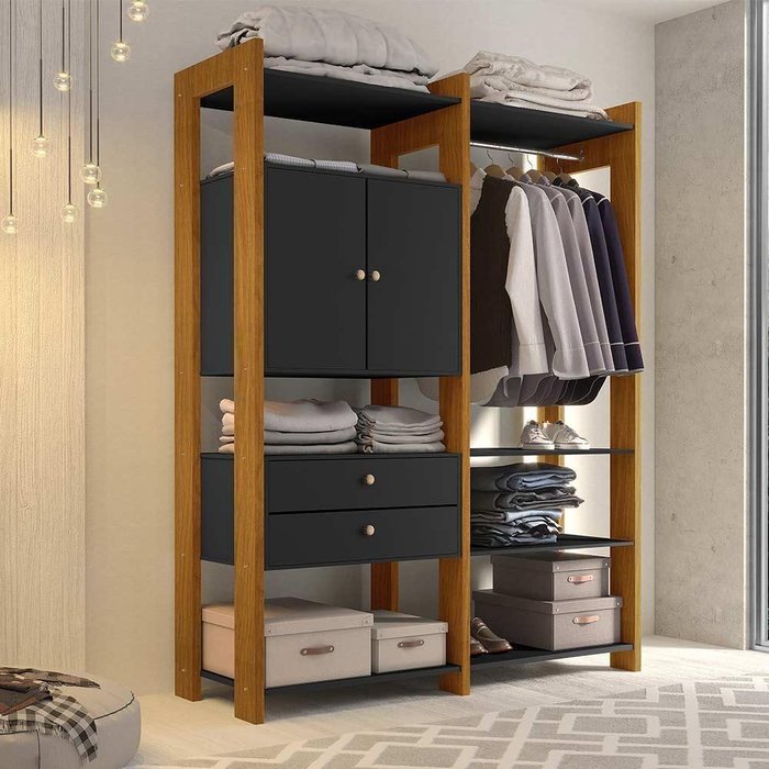 Dimensões do Produto: Altura 210,5 cm; Largura 141,5 cm; Profundidade 45 cm. Itens Inclusos: 1 guarda roupa aberto - 100% MDF - 2 gavetas com corrediças telescópicas - 2 portas (também pode ser montado sem as portas) - 1 prateleira interna (também pode ser montado sem a prateleira) - 1 cabideiro de metal - Diversas prateleiras com espaço para roupas, sapatos, roupas de cama, malas, e objetos pessoais - Design aberto que garante modernidade ao ambiente Complexidade da montagem: Média, pode ser montado por apenas uma pessoa e/ou necessite de maior conhecimento para montagem. Recomendações de uso, manutenção e limpeza: Limpar com flanela ou pano macio seco, não utilizar produtos abrasivos, desengordurantes, álcool ou solvente. Não expor o produto diretamente à luz solar e à umidade Garantia: 3 meses OBS: Foto meramente ilustrativa, objetos, utensílios e decoração não fazem parte do produto. Cor: Carvalho preto