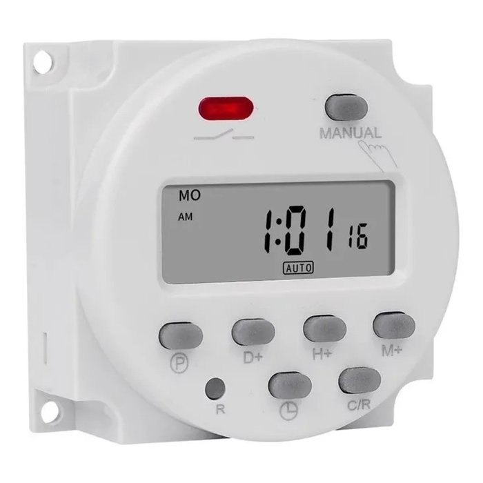 DESCRIÇÃO DO PRODUTO Timer CN101A Temporizador Semanal programável O CN101A liga e desliga automaticamente vários tipos de equipamentos elétricos em um tempo predefinido. Características: - Liga e desliga qualquer equipamento elétrico conforme programação. - 16 programas 8 para ligar e 8 para desligar - 24 horas / 7 dias programável por semana - Bateria interna de backup para memória - Faixa de temperatura de trabalho: -20 °C + 50 °C - Tensão de funcionamento: 12V, 24V, 127V, 220V(Não é selecionável) - Freqüência: 50/60hz - Consumo de energia: 4.5 VA (MAX) - Carga máxima: 16A resistivo / 8A indutivo - Faixa de temporização: 1 minuto a 168 horas - Dimensões: 6 x 6 x 3,5 cm ITENS INCLUSOS 1 x Timer 1 x Manual