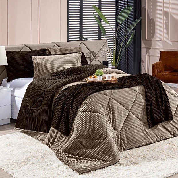 A nova coleção de coberdrons Denver traz toda a sofisticação e aconchego. Por possuírem dupla face, apresentam superfície que valoriza ainda mais as cores! Confeccionado em pantográfica computadorizada com lindos desenhos geométricos. Novidade e tendência para o inverno desse ano, o coberdrom é composto de Manta Canelada Microfibra, com aquele toque incrível que conforta e aquece nas noites mais frias. Composição feita em poliéster com 150gr de enchimento, maravilhoso, sofisticado e extremamente macio, perfeito para aquecer, acompanhando também os dois porta-travesseiros canelados com Zíper. Ideal para decorar, trazer conforto e tornar o quarto ainda mais convidativo e elegante! Confira! Contém:01 Coberdrom Queen 2,40m x 2,20m02 Porta Travesseiros Canelados 70cm x 50cm