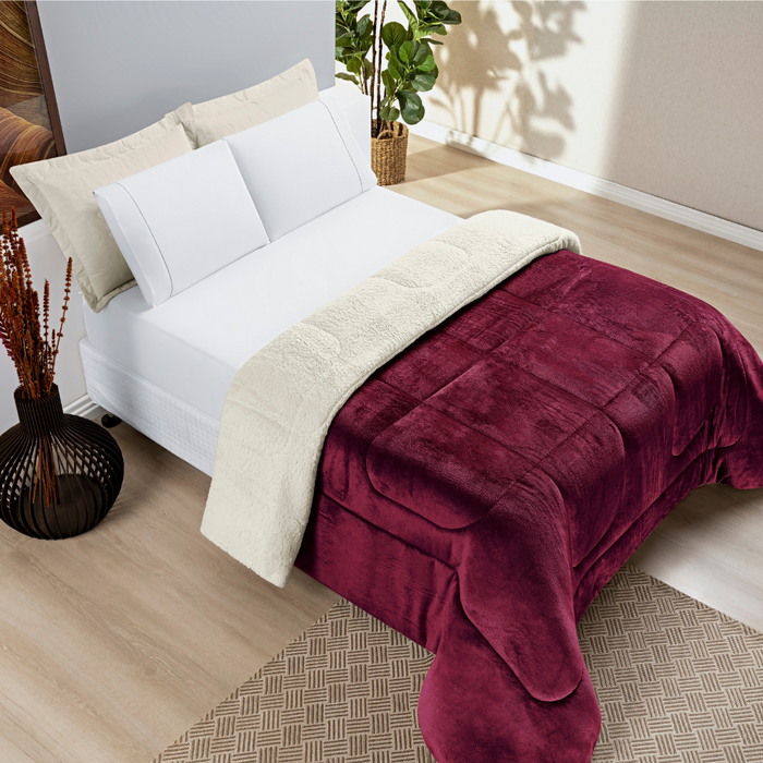 Coberdrom Sherpa Edredom Dupla Face Cobertor Manta Felpuda Liso Cama Casal Queen - Vinho