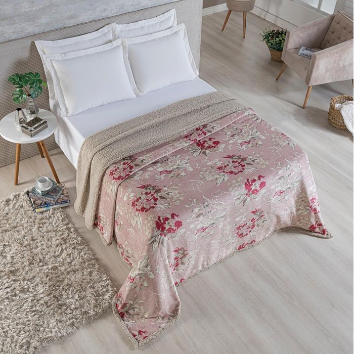 Cobertor Queen Austria Sherpa Pele De Carneiro Floral Rosê