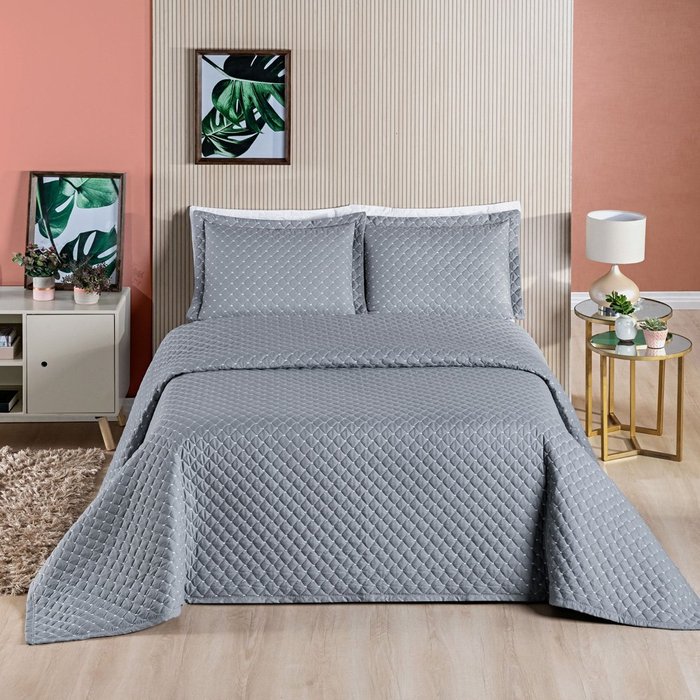 Cobre Leito Casal 3 Peças Ravena Colcha Bordado Geométrico 200 Fios Micropercal Diversas Cores Cinza Cinza
