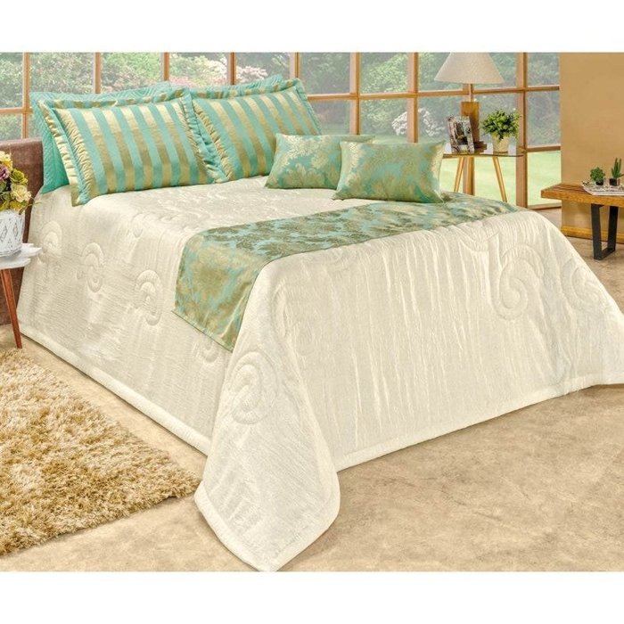 Cobre Leito Casal King Viena 06 Peças com Xale Tecido Seda - Verde Água