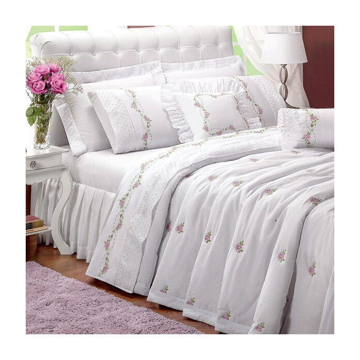 | Conteúdo da Embalagem | 01 Cobre Leito 2,60m comprimento x 2,40m largura; 02 Porta Travesseiros com Bordado Inglês 75cm x 55cm; 01 Capa de Almofada 45cm x 45cm; 01 Refil de Almofada 40cm x 40cm; 01 Rolo tamanho irregular |