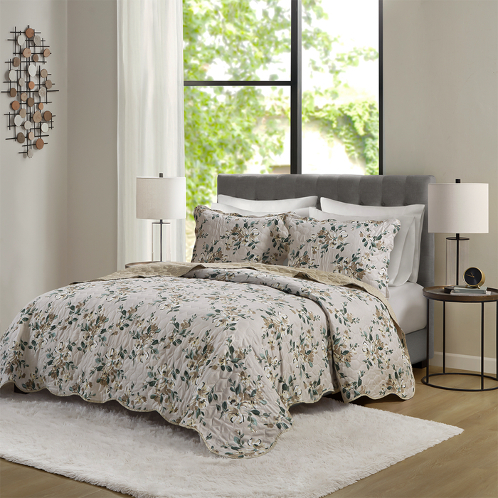 Cobre Leito Colcha Casal Dupla Face 03 Peças com Porta Travesseiro Aba Americana Flora