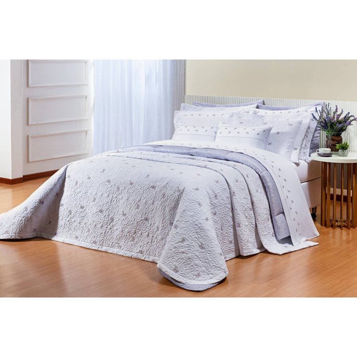 Com suavidade, estilo e conforto, o cobre leito dessa coleção foi confeccionado em tecido 100% Algodão - Percal 200 Fios. Medindo 3,15m comp. x 2.70m larg., este cobre leito acompanha dois porta travesseiros de 70cm x 50cm abas. Todas as peças com bordado trapuntado e um fino acabamento. Coleção: Lavendel