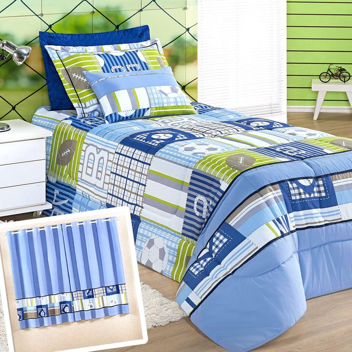 Cobre Leito Infantil Menino Azul Estampado Esporte + Cortina de Varão 2 Metros
