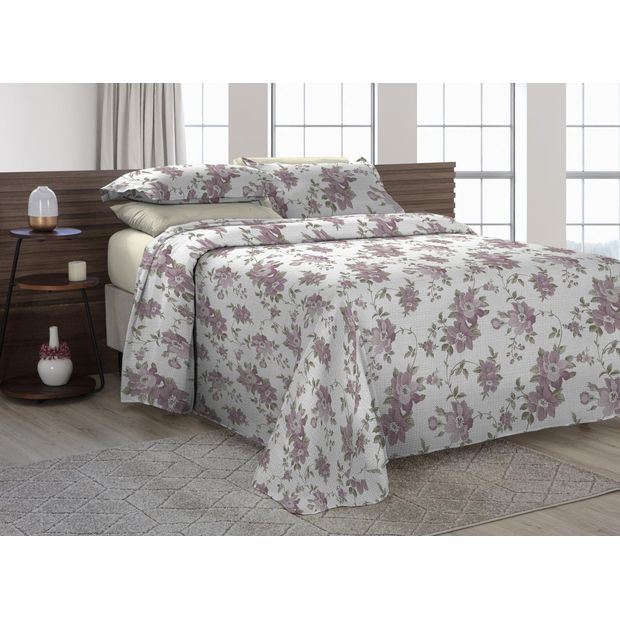 Cobre Leito Queen Com Fronhas 3 Peças Tecido Piquet Algodão Branco/Lilás