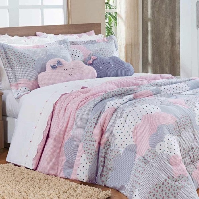 Leves e delicadas, as nuvens dão um toque lúdico ao ambiente, deixando o quarto lindo e superdivertido. Essa é a proposta da Coleção Micaela que, confeccionada em tecido estampado 100% Algodão Percal 200 Fios, deixará o quarto incrível! Kit acompanha Cobre leito + 02 porta travesseiros + 02 Almofadas nuvem Porta travesseiros estampado e com abas nos 04 lados Fechamento do Porta travesseiro em zíper, para melhor acomodar os travesseiros Cobre leito todo estampado combinando com os porta travesseiros Acompanha 02 Almofadas em formato de nuvenzinha Almofadas seguem com enchimento siliconizado, macio e confortável Detalhes das almofadas em carinha bordada e laço Tecido com Toque de Algodão, extremamente macio e sofisticado Confeccionado em tecido 100% Algodão Percal 200 Fios OBS: Jogo de lençol não acompanha o produto. Vendido separadamente. Contém na Embalagem: 01 Cobre Leito 2,60m x 2,40m 02 Porta Travesseiros 70cm x 50cm + Abas 02 Almofadas Nuvem tamanho Irregular, já com enchimento Características: Produto: cobre-leito para cama de casal queen Tecido: 100% Algodão Percal 200 Fios Quantidade de Peças: 05 Para colchão até: 2,00m comprimento x 1,60m de largura Almofadas com Enchimento: Sim Acompanha Jogo de Lençol: Não Detalhes Bordados: Sim