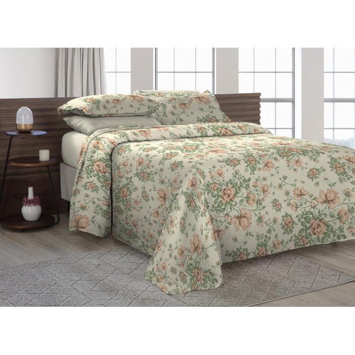 Cobre Leito Solteiro C/ Fronha 2 Peças Tecido Piquet Algodão Verde Floral