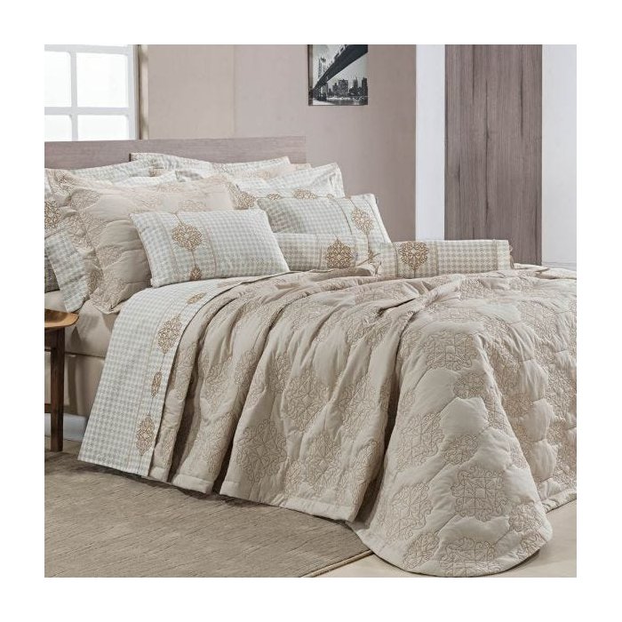 Cobre Leito Super King Bordado 100% Algodão Percal 200 Fios - Bristol 3 Peças Bege