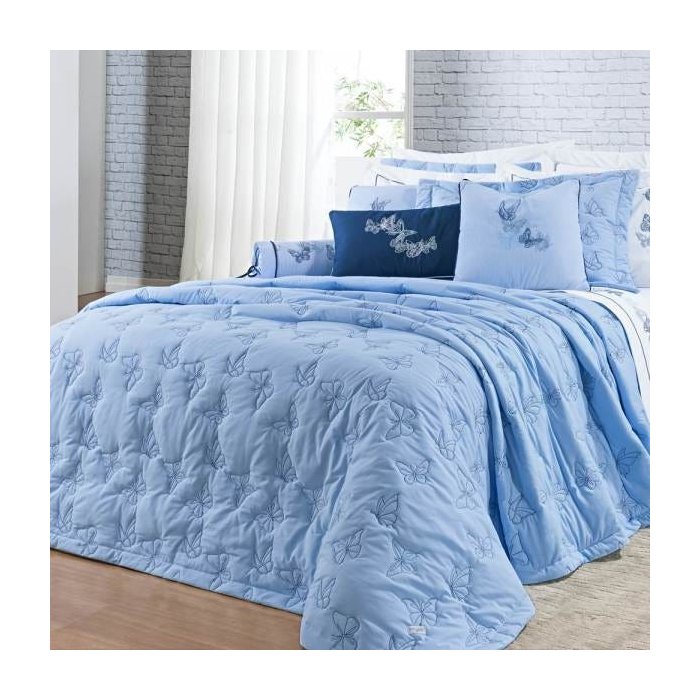 Cobre Leito Super King Bordado Algodão Percal 200 Fios - Yandra 3 Peças Azul