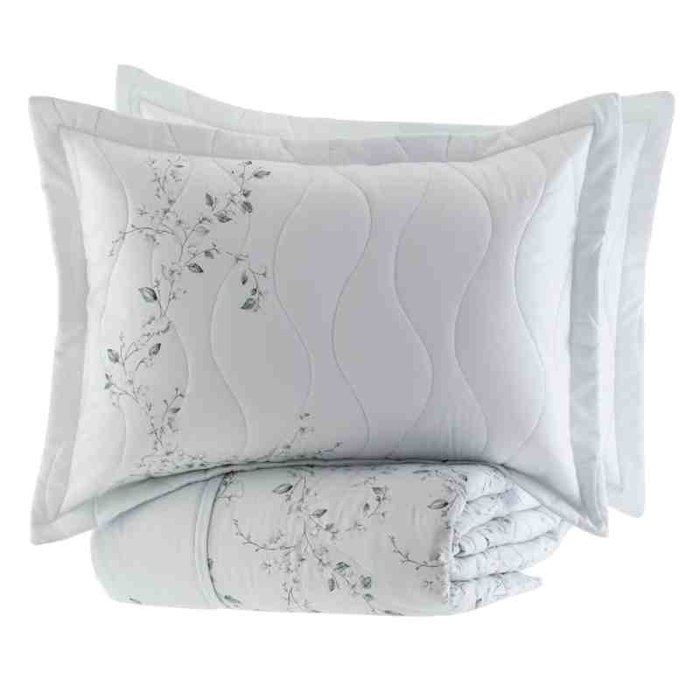 Itens inclusos: 01 cobreleito 2,40 x 2,60 m e 02 porta-travesseiros 0,50 x 0,70 m.
