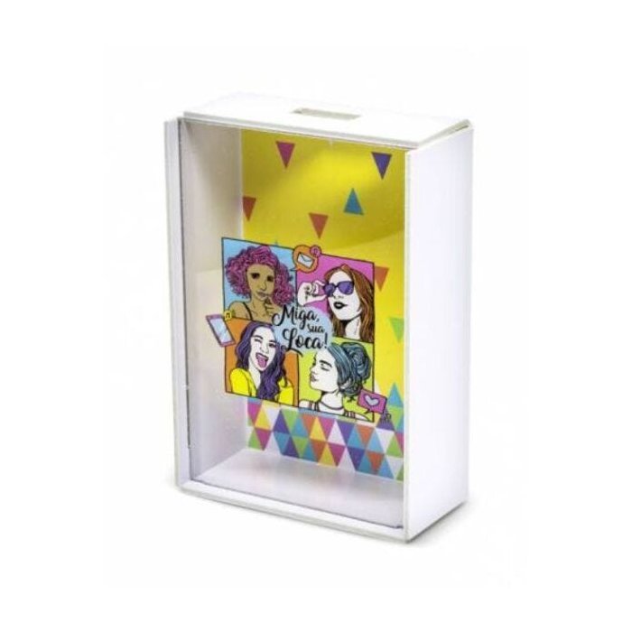 Cofre de mesa Â- MIGA SUA LOCA! Um lindo cofre de mesa pode ser o presente perfeito para aquela miga louca economizar! Material: plástico com arte frontal