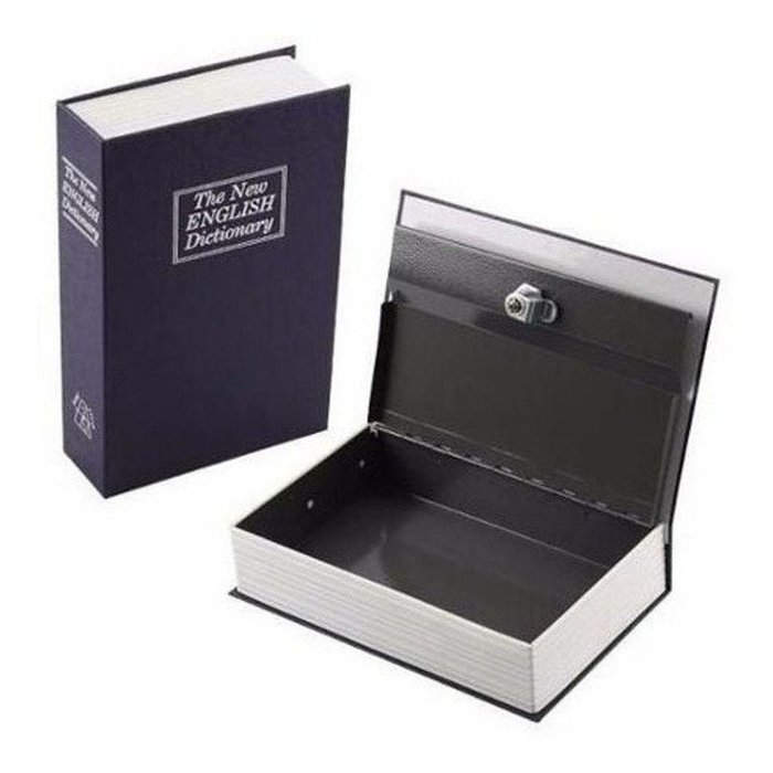 Visto por fora, o cofre é exatamente como um livro comum, um Dicionário de Inglês, por dentro possui um mecanismo de cofre com chave.