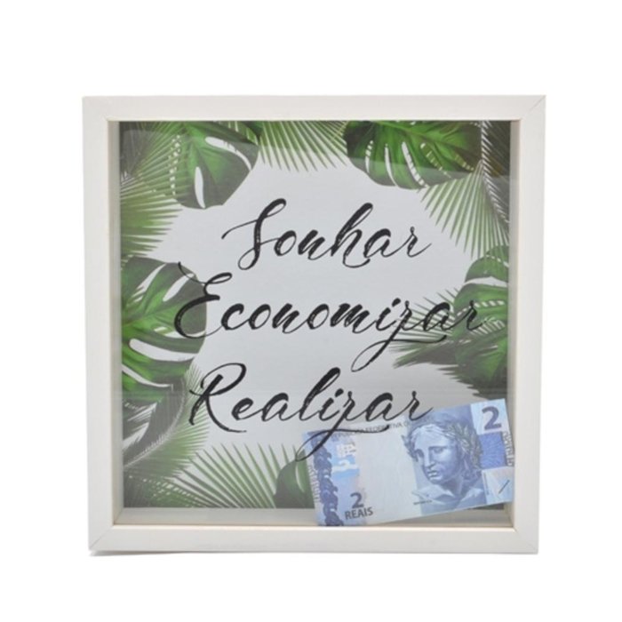 COFRE QUADRO DECORATIVO SONHAR ECONOMIZAR REALIZAR EM MADEIRA E VIDRO COM FUNDO REMOVIVEL