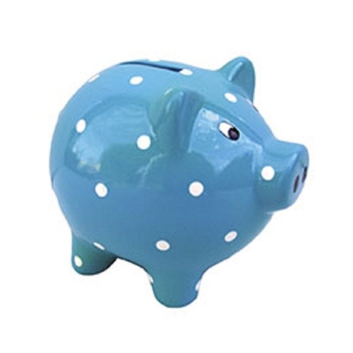 Cofrinho em formato de porquinho de cerâmica azul com bolinhas brancas. Um cofrinho colorido e alegre para sua filha economizar com muita diverção. Tamanhos: 15cm x 12 cm x 9cm. Recomendado para maiores de 3 anos. Produto projetado na Suécia. Marca: Jabadabado - Produto Importado.