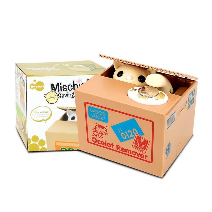 Coloque uma moeda no pratinho branco da caixa de laranjas e aperte o botão. Um gato vai aparecer para recolher a sua moeda e guardar. Elas ficarão armazenadas no interno do cofre e poderá as retirar quando quiser! Informações Técnicas:Alimentação: 2 pilhas AA (não inclusas) Material: Plástico + componentes eletrônicos O gatinho recolhe moedas de qualquer tamanho e peso Possui efeitos sonoros Deve ser colocado no pratinho 1 moeda por vezItens Inclusos:1x Cofrinho Gatinho que Puxa Moeda