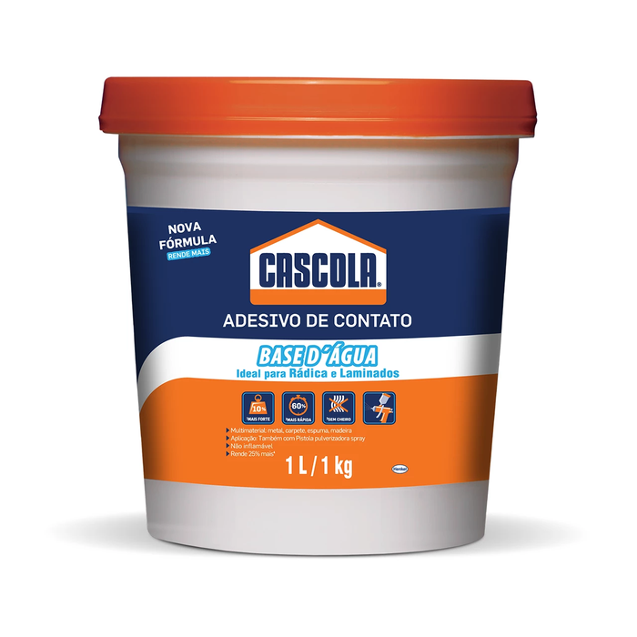Cascola Base D’Água é uma cola de contato com alta performance de colagem com tecnologia base de água, livre de solventes orgânicos e odor suave. Seu rendimento é aproximadamente 3x maior do que um adesivo à base de solvente, oferecendo excelente custo-benefício. Além da aplicação com instrumentos convencionais, Cascola Base D’Água também pode ser aplicada com uma pistola em spray. Indicada para colagem de carpete, Post Forming, madeira, laminados naturais e laminado plásticos decorativos (Fórmica®, Formiplac®, Perstop®), entre outros Por ser um adesivo base de água, é necessário que uma das superfícies de colagem seja porosa. * Não adere a materiais à base de Polietileno; Polipropileno; Silicone e PTFE ( Resina antiaderente).