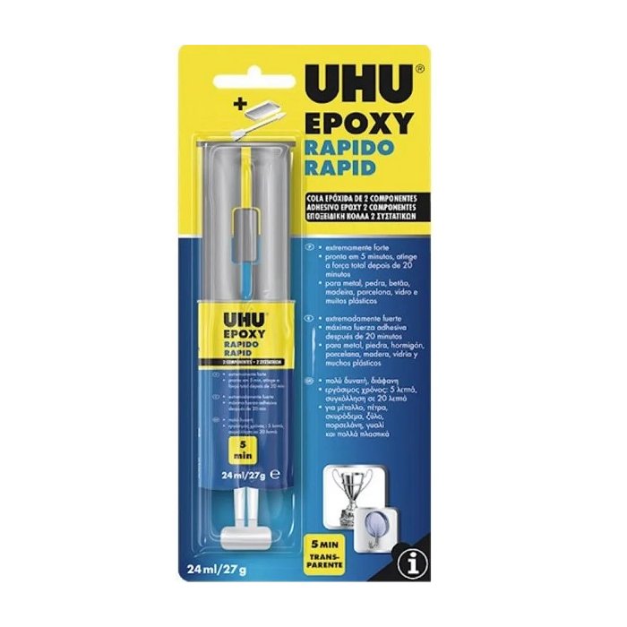 UHU EPOXI RAPIDO é uma cola epóxida de 2 componentes que permite uma colagem rápida e especificamente forte em apenas 5 minutos.