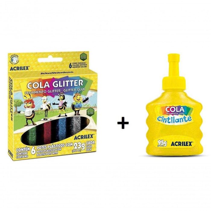 Kit Com 1 Cola Glitter 6 Cores 23g Acrilex + 1 Cola Especial para Artesanato Cintilante 95g Amarelo Acrilex