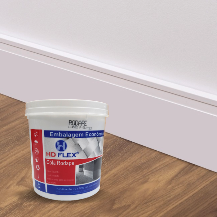 Cola Rodapé é um adesivo a base de copolimeros acrilicos a base de água com consis pastosa, desenvolvido para colagem de rodapés de madeira, EPS, Poliestireno, Pols entre outros tipos de rodapés e alguns tipos de molduras com uma alta aderência inic não necessitando o uso de pregos.