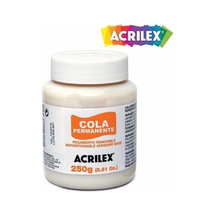 Cola Permanente 250g 1 Unidade 16225 - Acrilex- Indicada para preparação de suporte para fixação do tecido que será pintado.- Também pode ser utilizada para fixar os Stencils Acrilex sobre as superfícies que serão pintadas.- Pode ser utilizada também para fixar papéis, plásticos ou tecidos sobre materiais diversos como: gesso, madeira, cerâmica, metal, vidro, plástico etc.- Aplicar uma fina camada com pincel ou rolinho de espuma no avesso do Stencil ou diretamente sobre o suporte, que pode ser madeira, papelão, acrílico etc.-Deixar secar por 20 minutos antes de ser fixada. Pode ser reutilizada inúmeras vezes.- Pronta para o uso. Não tóxica. Apresenta efeito adesivo permanente- Não aplicar diretamente no tecido, pois pode causar manchas- Pode ser reutilizada várias vezes