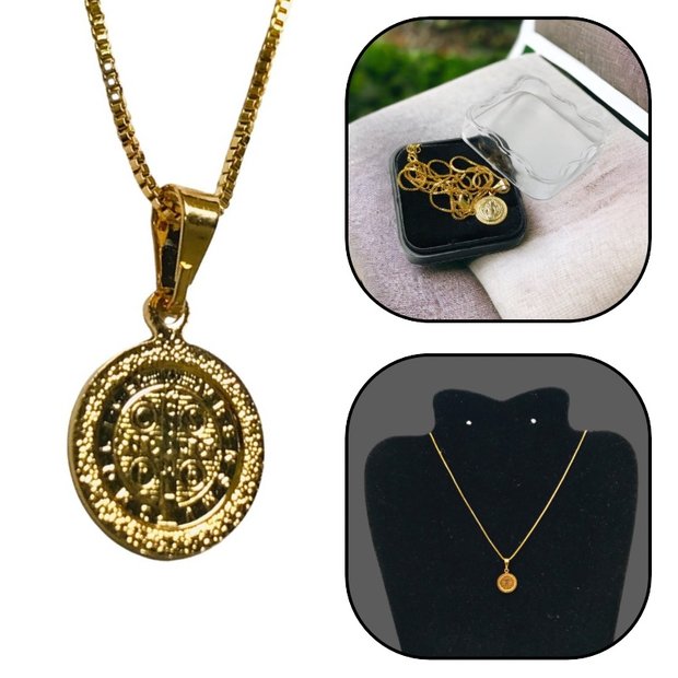 Este colar corrente da Medalha de São Bento é mais do que um acessório, é uma manifestação de fé e proteção. Feito em Aço Inox resistente e na cor dourada para proporcionar brilho e elegância, este colar possui um pingente com a forma da Medalha de São Bento. Além de adicionar estilo ao seu visual, ele também oferece uma proteção espiritual constante. Este colar é perfeito para quem busca uma conexão mais profunda com sua fé e deseja carregar consigo essa bela oração.